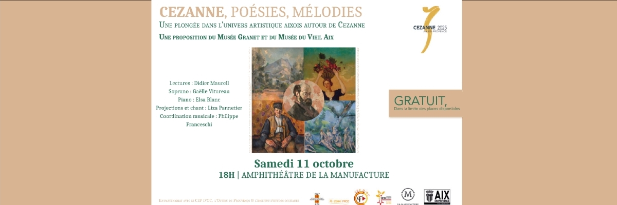 En 2025 toute la ville d’Aix-en-Provence se met au diapason de l’œuvre cézanienne et célèbre l’enfant du pays. Mais derrière l’artiste, le maître de l’art moderne internationalement reconnu, que sait-on du Provençal qu’était Paul Cezanne ? Le spectacle « Cezanne Poésies Mélodies » propose de plonger dans l’univers littéraire du maître en explorant son rapport à la langue d’oc provençale et aux écrits aixois de son temps. Dans cette création inédite élaborée par Didier Maurell, les oeuvres de Cezanne dialogueront avec des lectures poétiques et des interludes musicaux, mêlant chants et compositions de Gounod, Massenet, Bizet, Brahms, Maréchal ou de l’Aixois Gilles Borel.